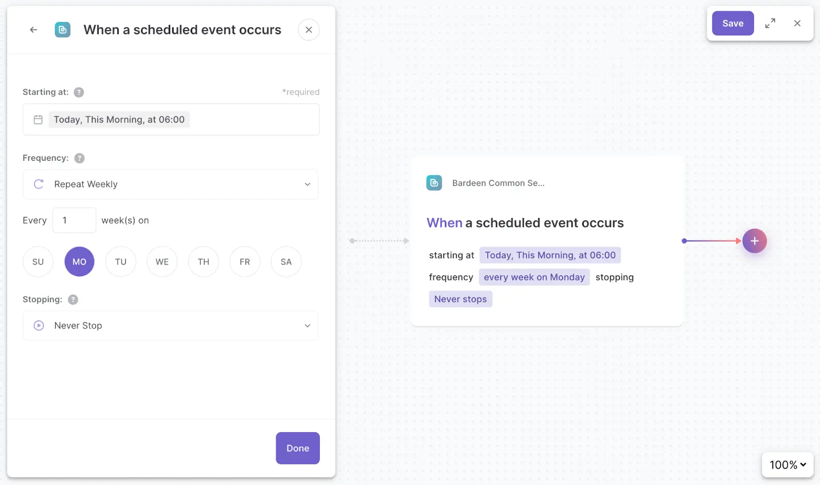 Kickstarts your workflow according to a custom schedule that you can define in the settings - like every weekday at 9 AM, or on the first Monday of every month and so on.