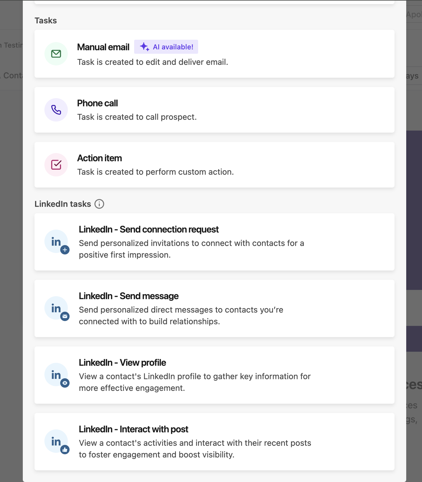 Apollo's Sequences feature includes social automation that simplifies your engagement with leads on platforms like LinkedIn. You can create tasks for various actions, schedule them according to your priority, and even automate interactions without manual input. This is a significant time saver for anyone looking to enhance their social selling efforts.