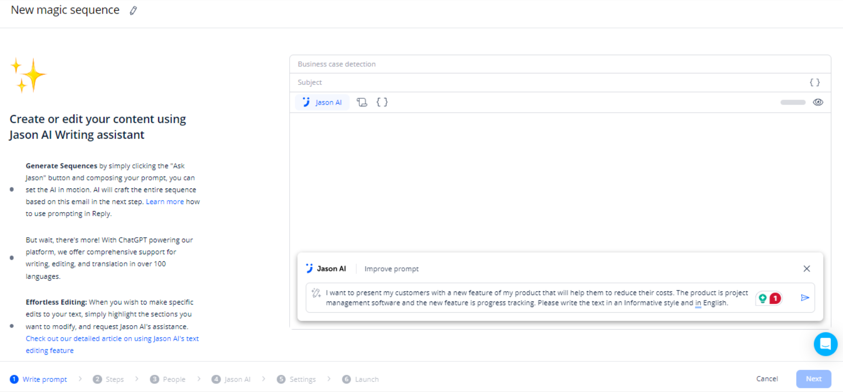 Reply.io's AI-powered writing assistant, Jason AI, enables users to generate entire email sequences with just a simple prompt. This ChatGPT-powered feature sets Reply.io apart, providing comprehensive support for writing, editing, and translation in over 100 languages.